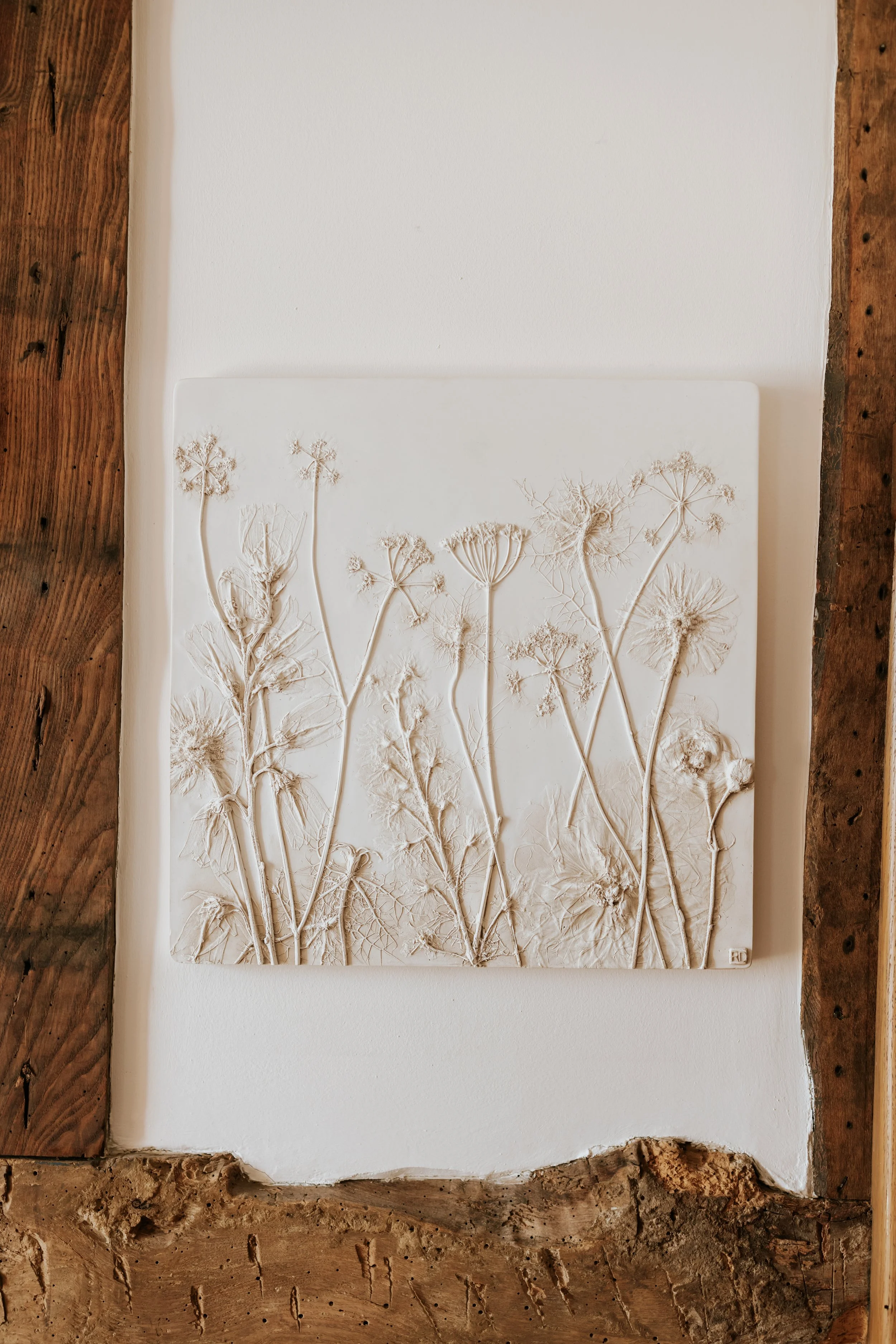 “The tile is beautiful and such a lovely way to remember our wedding day. Flowers are ephemeral but we have their imprint preserved forever. I like the white plaster finish of Rachel’s work – it seems particularly appropriate for a wedding momento, but also looks modern and attractive to hang almost anywhere in the house.”