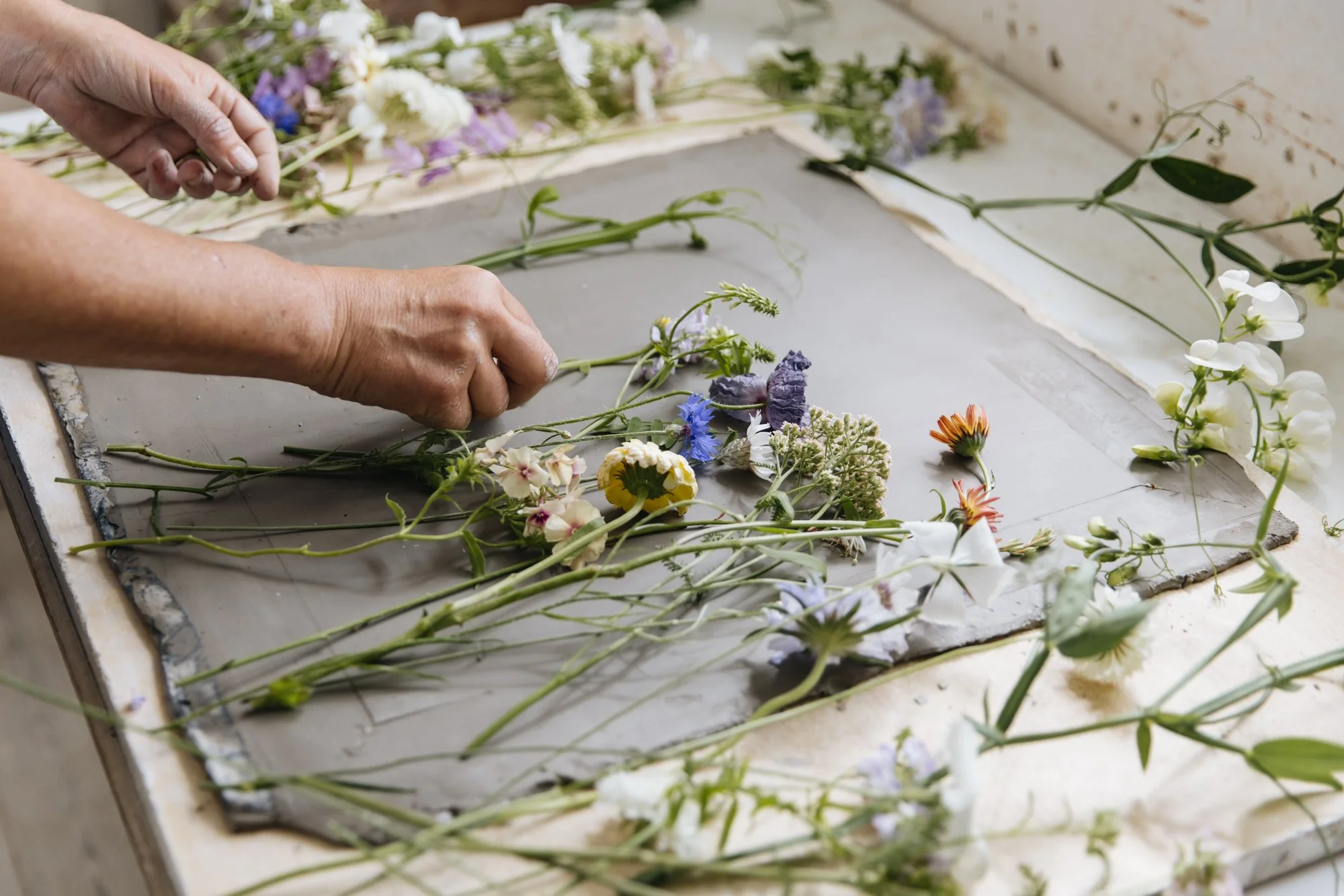 I make impressions of the flowers into wet clay and then pour plaster directly over it. The clay captures the most intricate details, subtly colouring the plaster as it sets. I invented this technique in 2011, and the first wedding flowers I cast were my own!